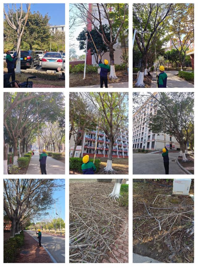 集中清理公共绿地落叶,修剪乔木枯枝断枝,修整灌木、绿地,开展病虫害防治消杀工作,更换主大门、新时代广场等重要景观节点的草花,对新时代广场区域的树池和旗台进行提升改造。