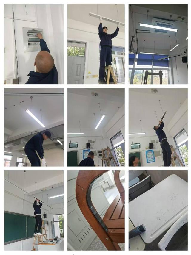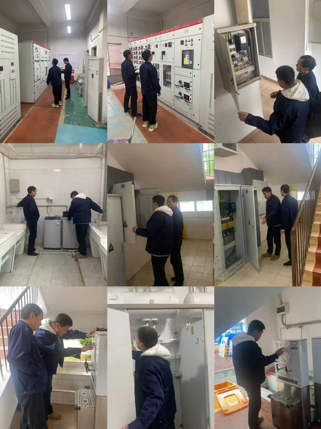 对高低压配电房和水泵房开展排查,对高压配电房进行年检和电力配件更换工作,排查维修公共区域照明设施,确保用水用电设施安全使用,对开水器维护清洗并更换滤芯,对学生公寓周边给水系统阀门进行优化改造。